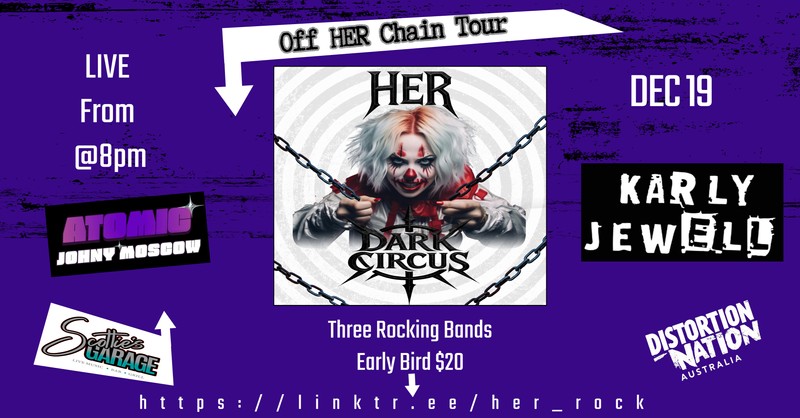 Her rely entirely on the support of their fans to keep their touring and production going, with all proceeds going directly to the artists and crew. The Off Her Chain tour is a celebration of passion, resilience, and the enduring spirit of Australian rock. Scotties Garage is the official launch of their latest Single Dark Circus. Local supports Johny Moscow and Karly Jewell will kick off the night.